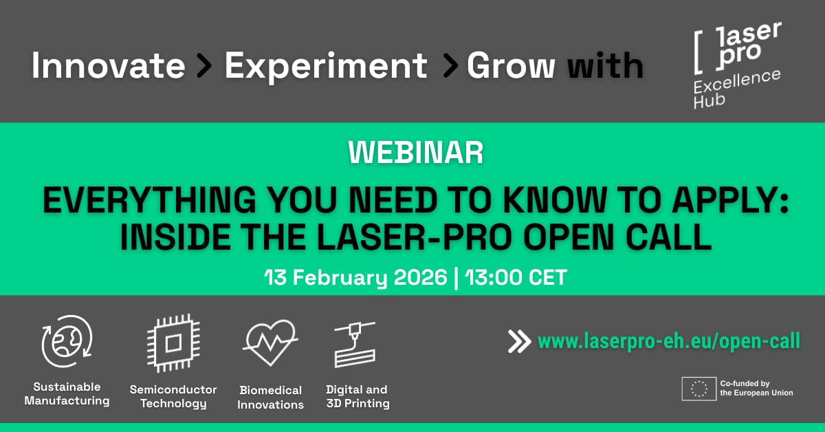 Join us for a dedicated webinar on 13 February at 13:00 CET, designed to help applicants navigate the LASER‑PRO Open Call, a funding scheme supporting SMEs and mid‑cap companies developing innovative solutions with advanced laser technologies. LASER-PRO will fund up to five companies, offering them access to high‑quality technical and business services through tailored Application Experiments.